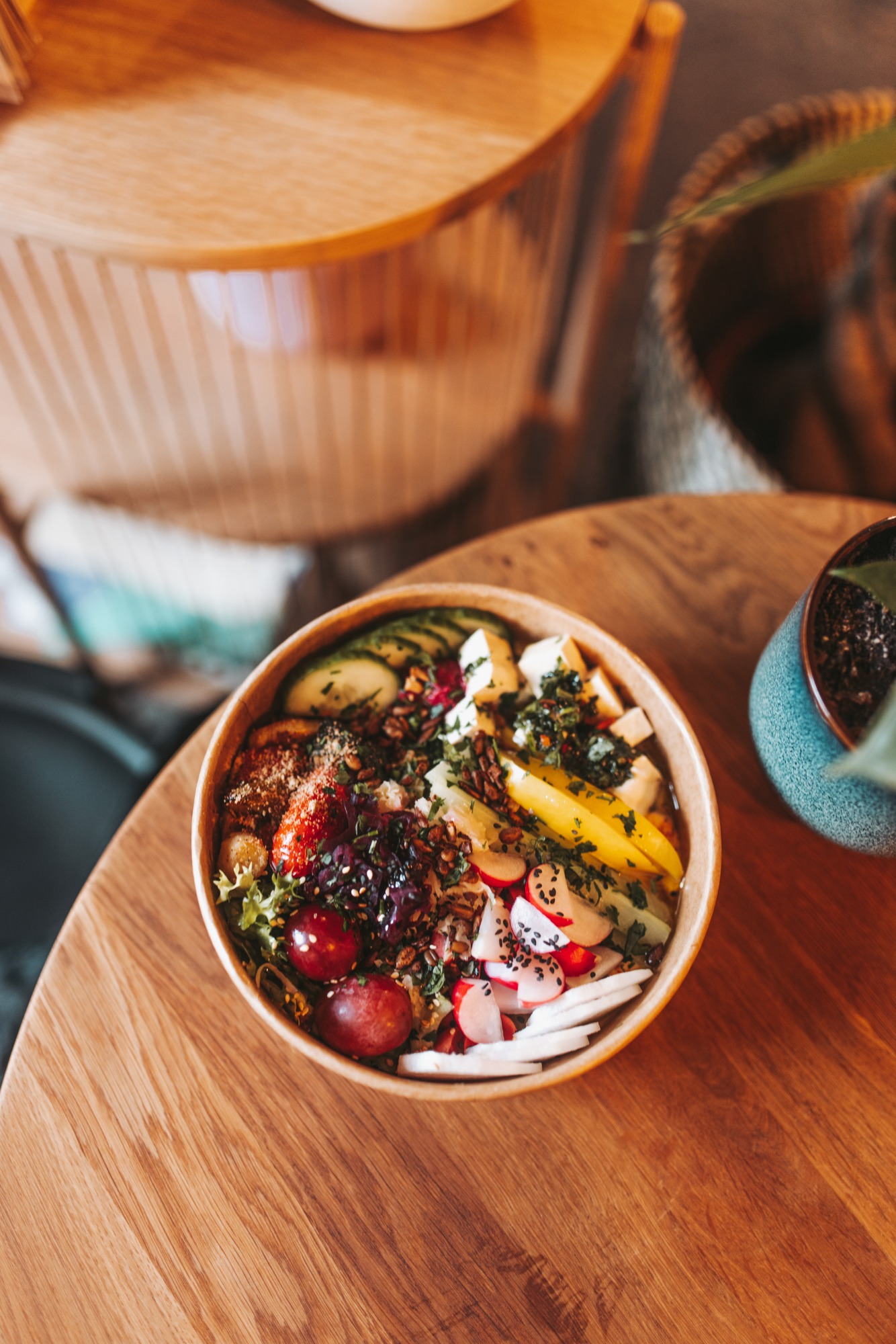 Śniadaniówka wegańska to ok.700 g pełnowartościowego i różnorodnego śniadania (choć niekoniecznie tylko śniadania), składa się z trzech różnych kontaktowych past, hummusu, świeżych warzyw, sałaty z winegretem, kiszonek od Pana Sznajdera, wegańskiej fety, orzeszków, zaataru i ziół.