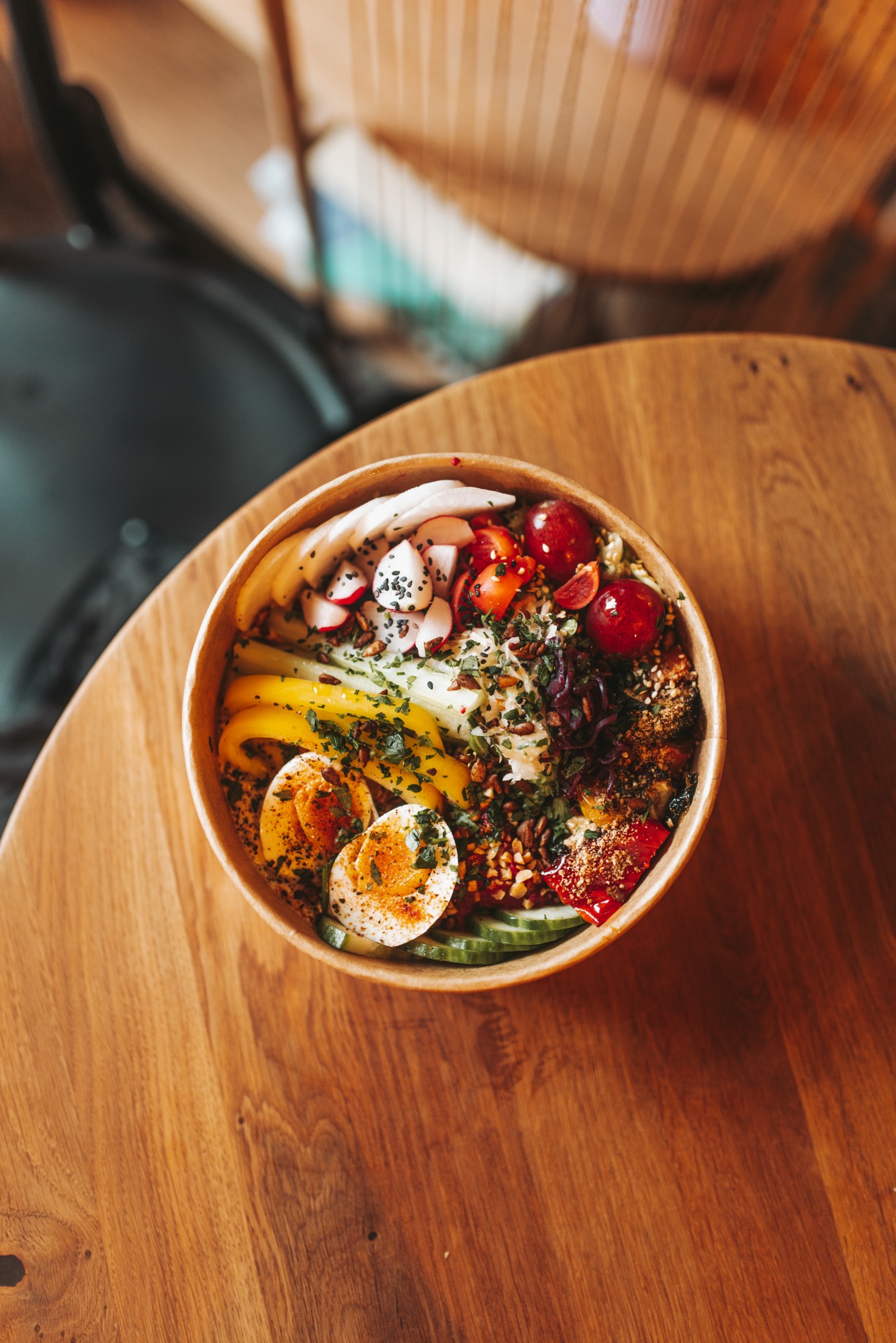 Śniadaniówka wegetariańska to ok. 700g pełnowartościowego i różnorodnego śniadania (choć nie tylko na tą porę!) składającego się z 3 różnych kontaktowych past, hummusu, świeżych warzyw, sałat z winegretem, kiszonek od Pana Sznajdera, jajka od szczęśliwej kurki, zaataru, orzeszków, ziół i oliwy. Podawana z 2 kromkami chleba żytniego
